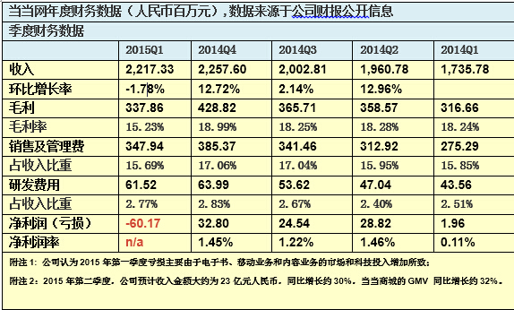 我們再看一下公司的業(yè)績表現(xiàn),以下表格是當(dāng)當(dāng)網(wǎng)的相關(guān)歷史財務(wù)數(shù)據(jù),從中可發(fā)現(xiàn)幾個比較顯著的特征: -這是一家業(yè)務(wù)比較穩(wěn)健的公司,各項比率在不同會計期間都比較不亂; -公司的業(yè)務(wù)也呈現(xiàn)穩(wěn)步增長的態(tài)勢; -2014年是第一年泛起全年盈利年份,主要仍是得益于規(guī)模的增長; -2015年第一季度重大虧損,主要由于電子書、移動和內(nèi)容業(yè)務(wù)的投入導(dǎo)致毛利下滑; 假如從資產(chǎn)負(fù)債角度看,截止2015年3月31日確當(dāng)當(dāng)網(wǎng)總資產(chǎn)約46億元人民幣,凈資產(chǎn)約6億元人民幣,現(xiàn)金及等價物(含短期投資)余額約為16.4億元人民幣,資產(chǎn)負(fù)債率接近87%,但資產(chǎn)的質(zhì)量仍是不錯的, 以活動資產(chǎn)為主。但因為凈資產(chǎn)總量偏低(近6億多人民幣),假如采取激進(jìn)經(jīng)營戰(zhàn)略又無法盈利的情況下,可能會導(dǎo)致凈資產(chǎn)為負(fù)數(shù),因此穩(wěn)健的經(jīng)營戰(zhàn)略是個現(xiàn)實的選擇。但可能正由于如斯,假如不考慮并購的整合效應(yīng),當(dāng)當(dāng)網(wǎng)的估值也會受一定程度的到負(fù)面影響。 從現(xiàn)金流角度看,2014年和2013年連續(xù)兩年的經(jīng)營流動現(xiàn)金流都是正數(shù),分別為2.65億和2.73億元人民幣。 所以從歷史數(shù)據(jù)來看,可以預(yù)計2015年當(dāng)當(dāng)網(wǎng)的收入規(guī)模會突破100億元人民幣的規(guī)模,基于公司歷史的穩(wěn)健經(jīng)營風(fēng)格和治理層在最新季度業(yè)績公告上所宣稱的對將來業(yè)績頗為樂觀,其業(yè)績猜測和估值水平到底應(yīng)該是多少才是公道和公允?