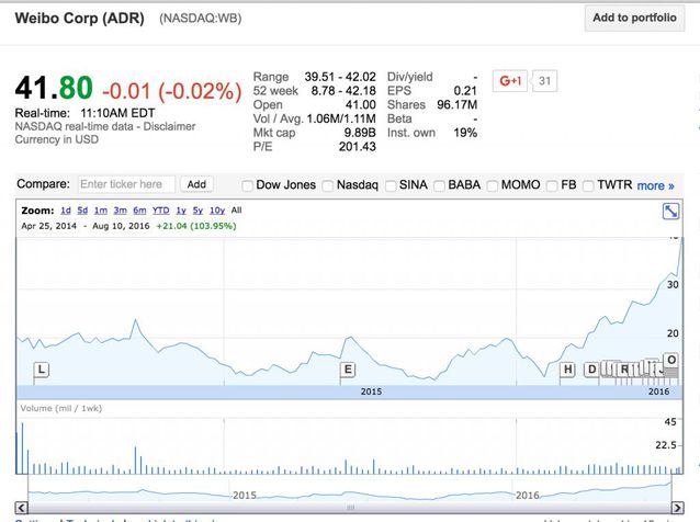 微博發(fā)布2016年二季度財(cái)報(bào),業(yè)績(jī)相稱亮眼,利潤(rùn)同比大漲5倍有余。 在中國(guó)互聯(lián)網(wǎng)這二十多年的發(fā)展歷史上,微博算是一個(gè)另類。它的獨(dú)特點(diǎn)在于,很少有像它這樣被輿論一致看好然后又一致看衰卻又在看衰中崛起的產(chǎn)品。 2011年,微博在輿論看多中走到頂峰,一度有所謂“微博改變中國(guó)”的說(shuō)法。 2012年,微博開(kāi)始走上下坡路,一個(gè)很有趣的現(xiàn)象就是,從“天天都要刷微博”到“現(xiàn)在還有什么人在用微博?” 2014年,微博上市,海內(nèi)輿論依然不是太過(guò)看好,一個(gè)很重要的原因在于,微信及其公家賬號(hào)平臺(tái)吸引了太多的目光。 2016年,微博強(qiáng)勢(shì)崛起,到8月份為止,股價(jià)已經(jīng)連拉六個(gè)月的陽(yáng)線。當(dāng)下股價(jià)創(chuàng)下歷史新高,突破40美元。 一 股價(jià)的上漲,背后是業(yè)績(jī)。打2014年上市之后,微博的業(yè)績(jī)的確讓人滿足。