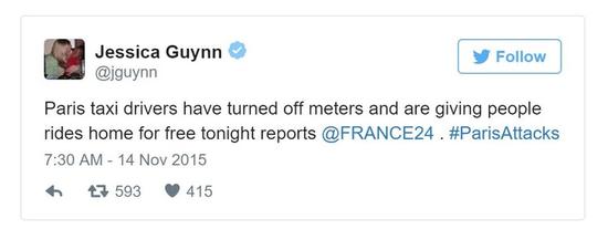 ![]() 目前,#PortOuverte在Twitter法國地區(qū)熱點度排名第二,僅次于事件本身的hashtag #fusillade。 下面是現(xiàn)在的巴黎,圖片來自Twitter@Uber_Pix ![]() |