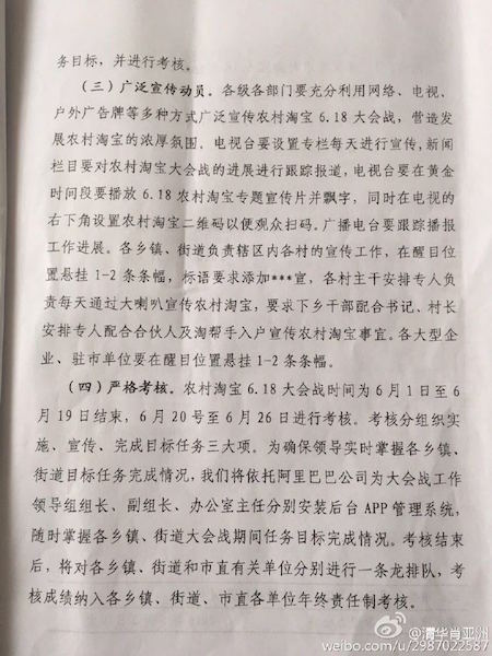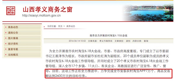 當(dāng)前,競爭日趨慘烈的“6.18”大戰(zhàn)終于落下帷幕,各大電商平臺(tái)紛紛曬出自己的“成績單”。根據(jù)農(nóng)村淘寶宣布的數(shù)據(jù),家電類產(chǎn)品在今年618期間銷量最佳,農(nóng)村淘寶好像已儼然成為家電數(shù)碼產(chǎn)品下鄉(xiāng)的主陣地。 然而,在阿里村淘看似繁榮的營銷數(shù)據(jù)背后,卻躲藏著行政干涉干與這只怪手。據(jù)傳,山西孝義市近期就發(fā)布了一份令人咋舌的文件,要求下級(jí)單位配合完成阿里村淘6.18交易額等指標(biāo)。 一、為推進(jìn)阿里村淘項(xiàng)目,孝義市強(qiáng)制向下攤派消費(fèi)指標(biāo) 日前,網(wǎng)絡(luò)上曝出一份山西省孝義市電子商務(wù)領(lǐng)導(dǎo)小組下發(fā)的紅頭文件,引來網(wǎng)友的廣泛關(guān)注和吐槽。文件內(nèi)容顯示,該市要求下級(jí)單位完成農(nóng)村淘寶在6.18期間的APP安裝量和交易額指標(biāo)。 詳細(xì)來看,孝義市擬定在2016年6月1日至19日期間,完成“安裝綁定農(nóng)村淘寶APP 7萬個(gè),商品交易額達(dá)到2600萬元”的目標(biāo)任務(wù)。為此,孝義市將指標(biāo)細(xì)化后,對市委、宣傳部等機(jī)關(guān)及企事業(yè)單位下發(fā)了明確的任務(wù)指標(biāo),甚至轄下的各鄉(xiāng)鎮(zhèn)、礦區(qū)和學(xué)校都被分配了上百、上千的APPA綁定任務(wù)。 同時(shí),孝義市要求各鄉(xiāng)鎮(zhèn)、街道和市直有關(guān)單位分別進(jìn)行一條龍排隊(duì),考核成績納入年終責(zé)任制考核。考核依托阿里巴巴公司為大會(huì)戰(zhàn)工作領(lǐng)導(dǎo)組組長、副組長、辦公室主任分別安裝后臺(tái)APP治理系統(tǒng),隨時(shí)把握各單位任務(wù)目標(biāo)完成情況。
