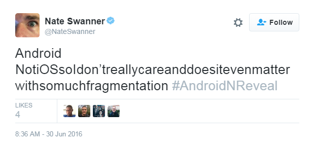 在各種候選名字中,Nutella(能多益)——這款意大利廠商Ferrero生產(chǎn)的聞名巧克力榛子醬受到很多用戶的支持,但未能終極被選中,據(jù)說還傷了不少網(wǎng)友的心。 除此之外,還有很多被網(wǎng)友寄予厚望的名字也慘遭淘汰,如印度網(wǎng)友提交的Neyyappam,這是一種來自印度的流行小吃甜點(diǎn),用大米和粗黃糖通過油炸制成;再好比New York Cheesecake”(紐約芝士蛋糕),這一度是谷歌內(nèi)部研發(fā)Android N的代號(hào)。 再好比下面這個(gè):