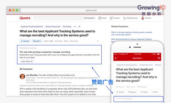 如上圖,廣告在疑問下方,還被標注上“某某推廣”的字樣。PC端的用戶會看到一小段推薦文字,在移動端中,就只有廣告商的姓名。 在正式引入廣告效勞之前,Quora 也進行了一系列的變現(xiàn)嘗試,包含 AMA(Ask Me Anything,咨詢我任何疑問)、付費打賞等。 關(guān)于許多創(chuàng)業(yè)公司來說,商業(yè)變現(xiàn)是一件很急切的事。只需流量滿意,大有些公司會挑選廣告投進作為盈余點。可是也有相當有些的公司,不太思考投進的廣告關(guān)于投進商和用戶是不是都有價值。Quora 對廣告投進的慎重情緒讓咱們看到,不論公司開展到啥期間,都不要影響給用戶帶來的價值。 (三)添加期Quora 一向是一家十分低調(diào)的公司,他們很少對外發(fā)布數(shù)據(jù),創(chuàng)始人也一向著重內(nèi)容的質(zhì)量和用戶體會才是他們真實關(guān)懷的工作?墒腔顫娪脩魯(shù)量最少能闡明Quora 的受歡迎程度,2016年3月他們宣告有1 億月活,到D輪就添加到1.9 億月活,時刻相差僅僅1年。這中心他們究竟做了啥? 2014 年 完結(jié) C 輪融資時,他們依然說這些錢的主要用途還是在商品優(yōu)化上。創(chuàng)始人的思路是先添加網(wǎng)站上的內(nèi)容,讓內(nèi)容與用戶數(shù)量相平衡,變現(xiàn)疑問就會方便的解決。 迭代過程中他們上線了許多新的功用,定時約請名人的微訪談 Writing Sessions,讓用戶能夠賞格發(fā)問的 Knowledge Prizes,以及約請了奧巴馬的名人認證等等。這些功用的中心意圖依然是進步內(nèi)容質(zhì)量,共享和促進常識添加。