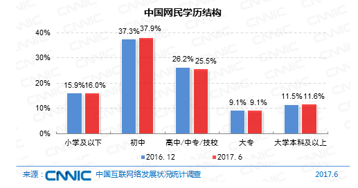 在學(xué)歷構(gòu)成上,我國(guó)網(wǎng)民依然以中等學(xué)歷集體為主,初中、高中/中專(zhuān)/技校學(xué)歷的網(wǎng)民占比別離為37.9%、25.5%。與2016年末比較,網(wǎng)民的學(xué)歷結(jié)構(gòu)改變不大。