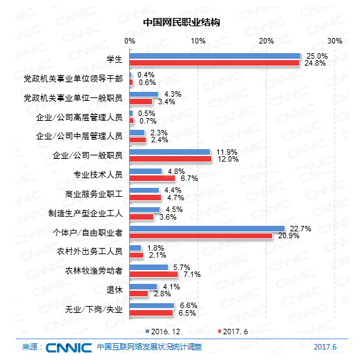 在工作結(jié)構(gòu)上,我國(guó)網(wǎng)民中學(xué)生集體占比依然最高,為24.8%;其次為個(gè)體戶(hù)/自由工作者,份額為20.9%;企業(yè)/公司的管理人員和一般職工占比算計(jì)到達(dá)15.1%。