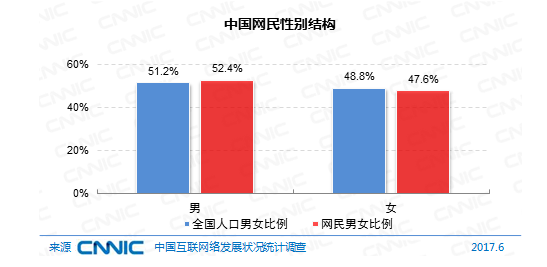 在性別構(gòu)成上,我國(guó)網(wǎng)民男女份額為52.4:47.6,同期全國(guó)人口男女份額為51.2:48.8,網(wǎng)民性別結(jié)構(gòu)趨向均衡,且與人口性別份額根本共同。