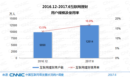 到2017年6月,我國(guó)購(gòu)買(mǎi)互聯(lián)網(wǎng)理財(cái)產(chǎn)品的網(wǎng)民規(guī)劃到達(dá)1.26億,較2016年末添加用戶(hù)2724萬(wàn)人,網(wǎng)民運(yùn)用率從13.5%升至16.8%。