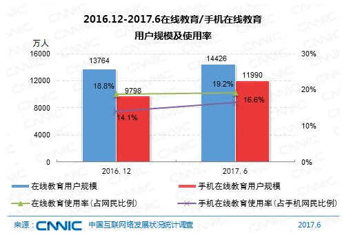 到2017年6月,我國(guó)在線教育用戶(hù)規(guī)劃達(dá)1.44億,較2016年末添加662萬(wàn)人,半年添加率為4.8%;在線教育用戶(hù)運(yùn)用率為19.2%,較2016年末添加0.4個(gè)百分點(diǎn)。其間,手機(jī)在線教育用戶(hù)規(guī)劃為1.20億,與2016年末比較添加2192萬(wàn)人,添加率為22.4%;手機(jī)在線教育用戶(hù)運(yùn)用率為16.6%,比較2016年末添加2.5個(gè)百分點(diǎn)。