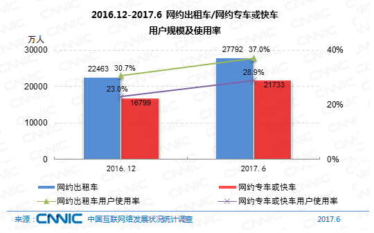 到2017年6月,我國(guó)網(wǎng)約出租車(chē)用戶(hù)規(guī)劃到達(dá)2.78億,較2016年末添加5329萬(wàn),添加率為23.7%。網(wǎng)約專(zhuān)車(chē)或快車(chē)用戶(hù)規(guī)劃到達(dá)2.17億,添加率為29.4%,用戶(hù)運(yùn)用份額由23%提高至28.9%。