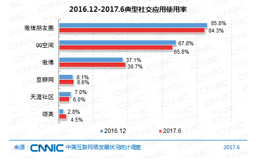 到2017年6月,運(yùn)用率排名前三的交際運(yùn)用均歸于綜合類(lèi)交際運(yùn)用。微信朋友圈、QQ空間用戶(hù)運(yùn)用率別離為84.3%和65.8%;微博用戶(hù)運(yùn)用率繼續(xù)回升,達(dá)38.7%,較2016年12月上升1.6個(gè)百分點(diǎn)。筆直類(lèi)交際運(yùn)用中,豆瓣用戶(hù)運(yùn)用率為8.6%。