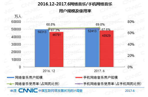 到2017年6月,網(wǎng)絡(luò)音樂(lè)用戶(hù)規(guī)劃到達(dá)5.24億,較去年末添加2101萬(wàn),占網(wǎng)民全體的69.8%。其間手機(jī)網(wǎng)絡(luò)音樂(lè)用戶(hù)規(guī)劃到達(dá)4.89億,較去年末添加2138萬(wàn),占手機(jī)網(wǎng)民的67.6%。