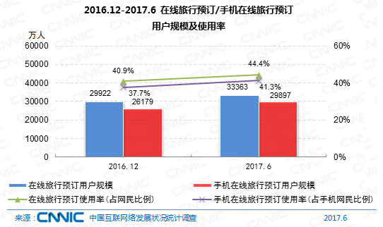 到2017年6月,在網(wǎng)上預(yù)定過(guò)機(jī)票、酒店、火車(chē)票或游覽休假產(chǎn)品的網(wǎng)民規(guī)劃到達(dá)3.34億,較2016年末添加3441萬(wàn)人,添加率為11.5%。在網(wǎng)上預(yù)定火車(chē)票、機(jī)票、酒店和游覽休假產(chǎn)品的網(wǎng)民別離占比37.6%,19.1%,20.5%和9.3%。其間,手機(jī)預(yù)定機(jī)票、酒店、火車(chē)票或游覽休假產(chǎn)品的網(wǎng)民規(guī)劃到達(dá)2.99億,較2016年末添加3717萬(wàn)人,添加率為14.2%。我國(guó)網(wǎng)民運(yùn)用手機(jī)在線游覽預(yù)定的份額由37.7%提高至41.3%。其間,手機(jī)預(yù)定酒店的運(yùn)用率提高幅度最大。