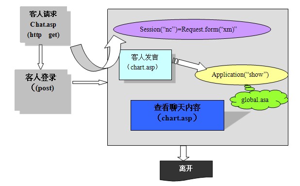 ![]() 聊天室處理流程 Global.asa文件的格局 global.asa文件實在是一個可選文件,它是專門存放全局變量和局部變量的文件,即在這里聲明具有會話和應(yīng)用程序作用域的變量,同時還可以指定事件程序,客戶端是看不到該文件的,它存放在應(yīng)用程序的根目錄下,文件名必需是global.asa,每人應(yīng)用程序只能有一個global.asa文件,文本中不能有HTML標(biāo)記,不答應(yīng)更改文件名。格局如下: <script language=”VBScript ” runat=”Server”> Sub session_OnStart 當(dāng)客戶首次運行ASP應(yīng)用程序中的任一頁面時運行。 …….. End sub Sub session_OnEnd 當(dāng)某客戶會話超時或退出應(yīng)用程序時運行。 …….. End sub Sub Application_Onstart 當(dāng)任何客戶首次訪問該應(yīng)用程序的首頁面時運行。 …….. End sub Sub Application_OnEnd 當(dāng)該站點的WEB服務(wù)器封閉時運行。 …….. End sub </script> |