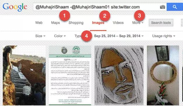 Echosec和Geofeedia可將人物和地點(diǎn)聯(lián)系起來(lái) 在這個(gè)例子中,我鍵入了殼牌總部的地址(1)但愿找到特定時(shí)間(2)內(nèi)在那里工作的人(3)發(fā)布的信息。 8.在Google Images里搜索圖片 良多時(shí)候用戶(hù)會(huì)刪除他們發(fā)布的信息,這時(shí)候你就無(wú)法在Echosec or Geofeedia里檢索到這些信息。但是你仍是可以通過(guò)Google Images來(lái)搜尋這些信息。 在下面的例子中,我要檢索Twitter(3)上一個(gè)名字是@MuhajiriShaam (1)的賬號(hào),首先要剔除一個(gè)非常類(lèi)似的賬號(hào)@MuhajiriShaam01 (2),然后查看他在9月25日到9月29日之間(4)在Twitter上發(fā)布的照片。