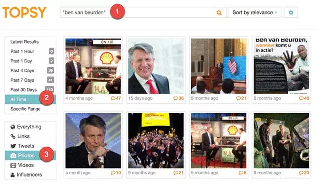 使用這個(gè)指令進(jìn)行檢索,你會(huì)得到關(guān)于包含樞紐“Shell”但是不包括“Ben”的結(jié)果。你會(huì)發(fā)現(xiàn)殼牌CEO Ben van Beurden也常常會(huì)被稱(chēng)為“Bernardus van Beurden”。 盡可能檢索到關(guān)于目標(biāo)人物或事件更多的代稱(chēng),可以讓你把握的信息更加充分和完整。 6.在Toipsy中使用圖片搜索