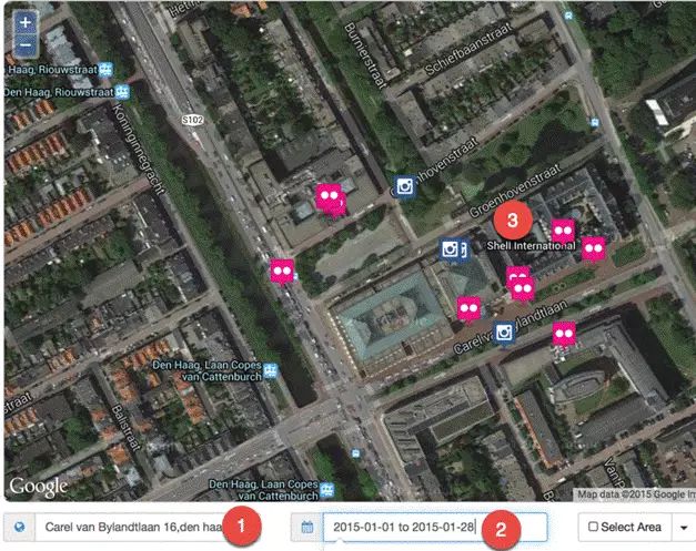 你可以在網(wǎng)站尋找信息,來(lái)分析你要研究的對(duì)象。鍵入你要檢索的樞紐詞(1),選擇時(shí)間(2),你可以看到其他人在Twitter上傳的有關(guān)圖片(3)。 假如你要搜索一個(gè)特定的時(shí)間,你還可以通過(guò)期間菜單的“Specific Range”選項(xiàng)設(shè)定你需要的時(shí)間。 7.使用Echosec 或者Geofeedia來(lái)確定人物和位置