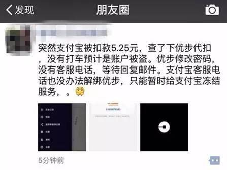 這條朋友圈的大概內(nèi)容就是,他的優(yōu)步賬號(hào)被盜刷了,而且,除了凍結(jié)支付寶,一點(diǎn)辦法也沒(méi)有。。。 當(dāng)然,這有可能是個(gè)個(gè)例。
