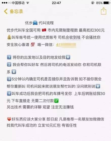 也就是說(shuō),他利用一個(gè)盜取的賬號(hào)幫你叫車(chē),無(wú)論路程多遠(yuǎn),你只需要暗里給他 30 元,就可以拍拍屁股走人了。。而實(shí)際打車(chē)用度,就由那些被盜號(hào)的人承擔(dān)了。。。 上圖還特么宣傳了可以教你,這樣的技術(shù): 另出技術(shù),需要的詳聊,觀望,注定無(wú)法賺錢(qián)。 好東西應(yīng)該大家分享,即日起,凡是推薦一名朋友加我微信找我代叫車(chē)成功的,立發(fā) 10 元紅包,有錢(qián)率性。 (踏馬的,有錢(qián)還干這種齷齪事??)