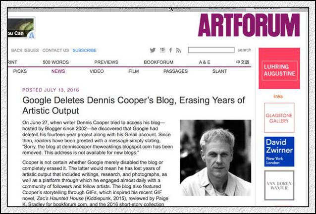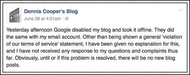 棲身在法國的美國藝術(shù)家丹尼斯·庫柏(Dennis Cooper)14年來發(fā)布在全球最大的互聯(lián)網(wǎng)平臺上的作品溘然消失了,他的谷歌博客、谷歌郵箱同時被刪除。 丹尼斯·庫柏從2002年起開始使用埃文·威廉姆斯創(chuàng)辦的博客平臺Blogger,2003年,谷歌收購了Blogger。今年6月底,庫柏發(fā)現(xiàn)他的博客被下線了。同時,他發(fā)現(xiàn)自己的谷歌郵箱也被禁用了。 庫柏告訴聞名新聞網(wǎng)站 Fusion 記者伊森·切爾(Ethan Chiel),谷歌沒有給出任何刪除其博客與郵箱的理由。