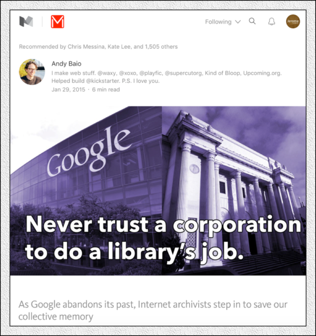 伊森·切爾寫道:Google說自己的“使命在于整合全球信息,使人人都能訪問并從中受益”,但它是否有愛好維護(hù)歷史記實(shí),或者匡助他人這么做,并不清晰。伊森·切爾引用學(xué)者安迪·拜奧(Andy Baio)的話說:在本世紀(jì)初谷歌曾許愿的很多歷史文檔存檔項(xiàng)目,好比谷歌新聞、Google Groups存檔,都在幾年前被靜靜拋卻了。 安迪·拜奧說: “我們不能期待一個以贏利為目的的企業(yè)會在意過去。”也就是說,假如互聯(lián)網(wǎng)是你的檔案柜,你的檔案時刻處在危險之中。