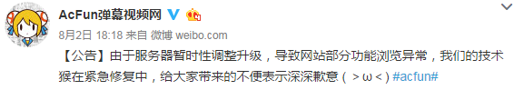 A站2016年8月2日就在官方微博上表示,因?yàn)锳站服務(wù)器暫時(shí)性調(diào)整進(jìn)級(jí),導(dǎo)致網(wǎng)站部門功能瀏覽異常,A站的技術(shù)職員在緊急修復(fù)中,給大家?guī)?lái)的不便表示深深歉意。