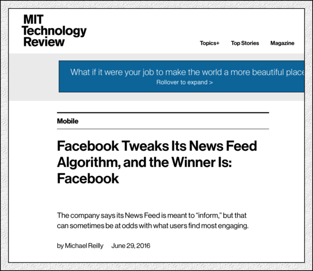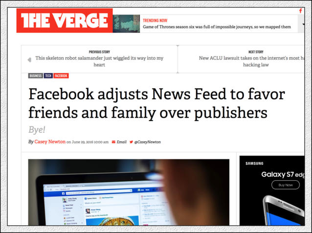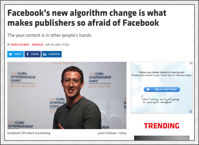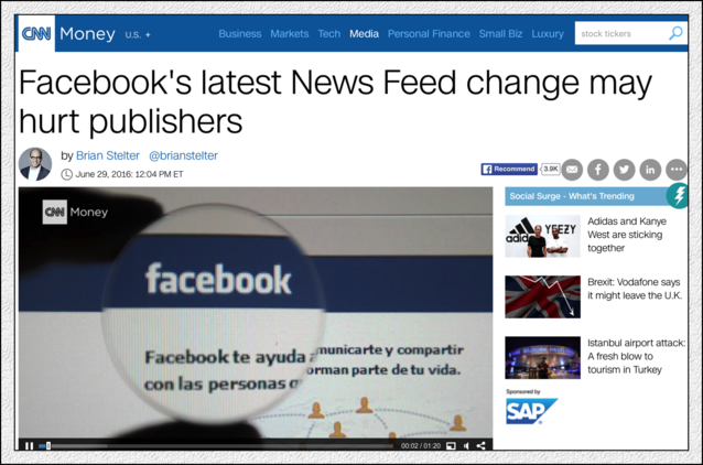 6月底,F(xiàn)acebook又公布調(diào)整算法了,這回調(diào)整,受傷的仍是媒體(Publishers)。幾乎所有的美國媒體這幾天討論的都是Facebook算法,以及自己身上正在流血的傷口?膳碌氖牵襟w們?cè)谶M(jìn)行這次報(bào)道的時(shí)候,洋溢的是某種哀怨,而不是憤怒。他們憤怒,但表現(xiàn)的只是哀怨。與狼共舞,不時(shí)地被狼咬上一口,很正常的。 在2016年5月經(jīng)歷了“Facebook新聞偏見門”、Facebook “蒂爾門”兩次沖擊之后,美國的媒體可能無法想象,這么快又會(huì)面對(duì)一次來自Facebook的新的震撼教育。