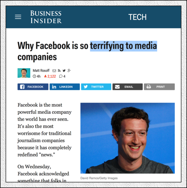 哈佛大學(xué)聞名的尼曼媒體實(shí)驗(yàn)室也發(fā)了評(píng)論,評(píng)論的標(biāo)題看起來實(shí)話實(shí)說,沒有出人意料之處,但恍惚處理的題圖把Facebook幾個(gè)字折騰得面目全非,顯然有些感情用事。