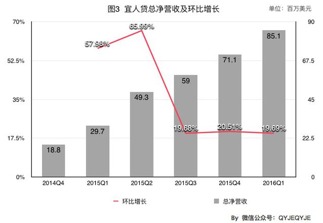 圖中紅框部門顯示,在Q2季度,Deferred revenue(遞延收入)和Cash revenue泛起失常,不遵循相關會計配比原則。 而風險預備金項,基本維持在總收費額的30%左右,符合配比原則。 (遞延收入,是暫時未確認的收益意思,由權責發(fā)生制和收付實現(xiàn)制的暫時性差異產(chǎn)生)。 因此,我們發(fā)現(xiàn)了秘密所在:宜人貸通過調(diào)整遞延收入確認時間以及人為控制的現(xiàn)金激勵,調(diào)整了會計利潤,以符合相關上市要求。 這也解釋了,為什么凈利潤和總凈營收,會在Q2季度泛起意外不符合相關會計規(guī)律的現(xiàn)象。 在以后解讀宜人貸財報,這兩個數(shù)據(jù),將是考驗利潤“含金量”相對有效的地方。 在2016Q1季度,同比增速情況如下: