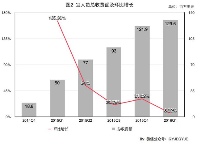 近期,跟著P2P標桿Lending Club的隕落,股價斷崖式暴跌,9年的co-founder and CEO被逐出公司,fintech概念從神壇走下; 美國財政部隨后于5月10日發(fā)布網(wǎng)貸白皮書,題為“網(wǎng)絡市場化信貸的機遇與挑戰(zhàn)”(Opportunities and Challenges in Online Marketplace Lending),闡述對行業(yè)擔憂,政策風口一再走緊; 雪上加霜的是,Google也于昨天晚間公布“下架小貸廣告”,成為壓垮美帝網(wǎng)貸的最后一根稻草,行業(yè)遠景堪憂。 而與此同時,大西洋彼岸擁有中國特色的P2P公司——宜人貸,高調(diào)發(fā)布了自己2016年Q1季度財報,華麗的數(shù)字,使得股價也應聲上漲5.83%。 本文將圍繞這一季財報,展開分析,探討財報數(shù)字背后,這家P2P公司詳細的發(fā)展情況。 財務業(yè)績分析 看點一:借款總額、總收費額,持續(xù)增長;環(huán)比增長,駛入慢車道 先來看每季度借款總額變化情況,如下圖1