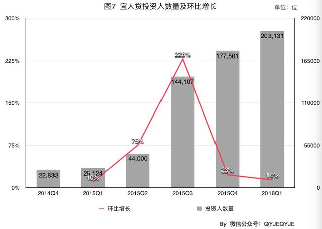 單借款人數(shù)變化情況,與看點一整體波動情況以及正?袋c二波動情況相似。增速都是在2015Q3季度泛起相對低谷;跟著宜人貸上市,泛起短暫的反彈;而后跟著整體宏觀環(huán)境,達到歷史最低點。 當然,整體絕對值情況,仍舊是繼承不亂發(fā)展。