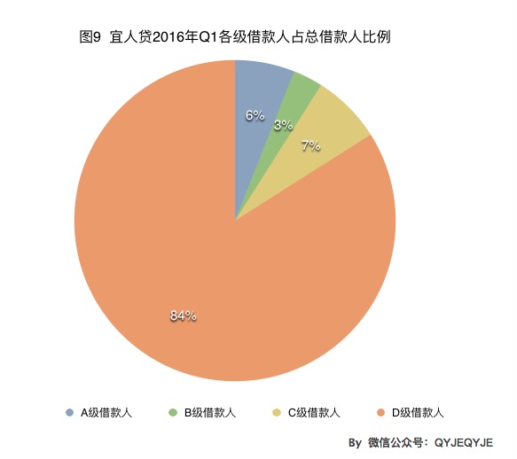 趨勢很顯著,宜人貸在2015Q4季度后,對于借款人以及標的來源,有意識的降低要求,減輕對線下的資源依靠。其中,還專門表露了Q1季度,來自移動借款真?zhèn)數(shù)據(jù)32.8%,PC端數(shù)據(jù)為55%,合計線上88%。 對于投資人方面,宜人貸已經(jīng)于2015Q4季度,全部實現(xiàn)了線上。目前投資資金全部來自線上,沒有通過線下交易。 說明其逐漸實現(xiàn)了網(wǎng)絡借貸本身的含義。 壞賬情況分析 看點五:刀尖上嗜血,風險加大 宜人貸把客戶分為ABCD四類,A類信用最高,D類信用最差。下圖是借款利率情況: