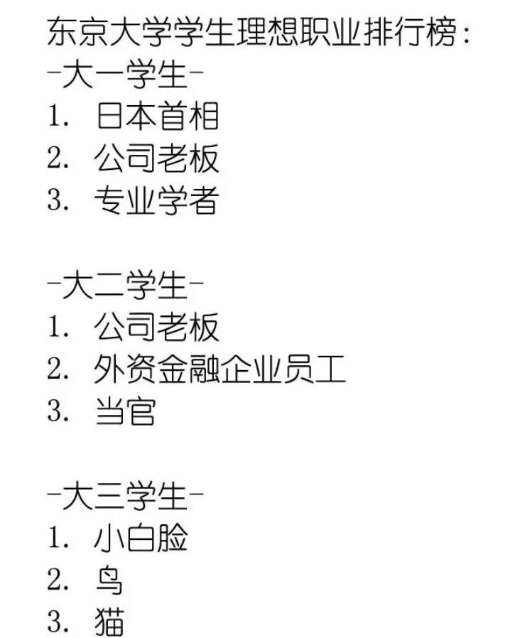 昨日推特上這張圖火了 東京大學(xué)學(xué)生抱負(fù)工作排行榜 不同年級的同學(xué)差別很大呢