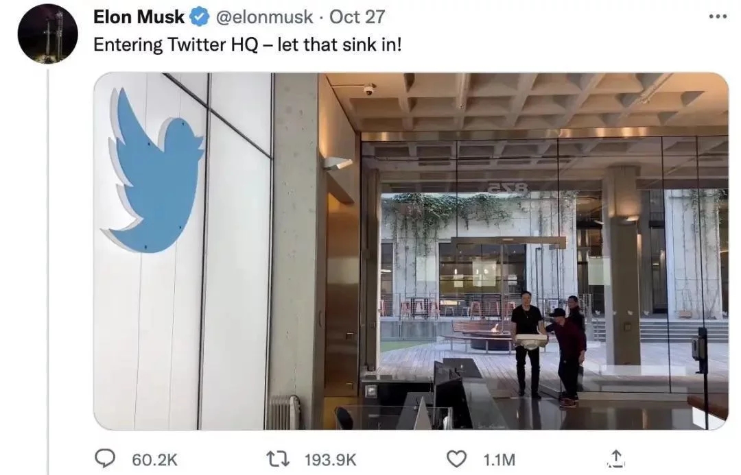 馬斯克來(lái)了——Let that sink in. 周四,爛梗王馬斯克真就這樣抱著一個(gè)水槽,推開(kāi)了 Twitter 公司舊金山總部的大門。