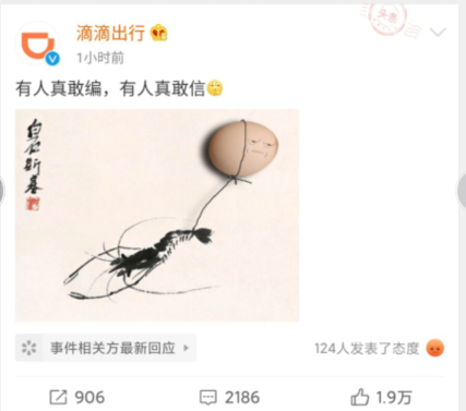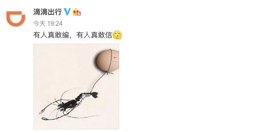 6月11日晚間,@滴滴出行 官方微博發(fā)布了一則很奇怪的微博,文字稱“有人真敢編,有人真敢信”,并且配上了一個摳鼻的表情,和一張“蝦扯蛋”的圖片。