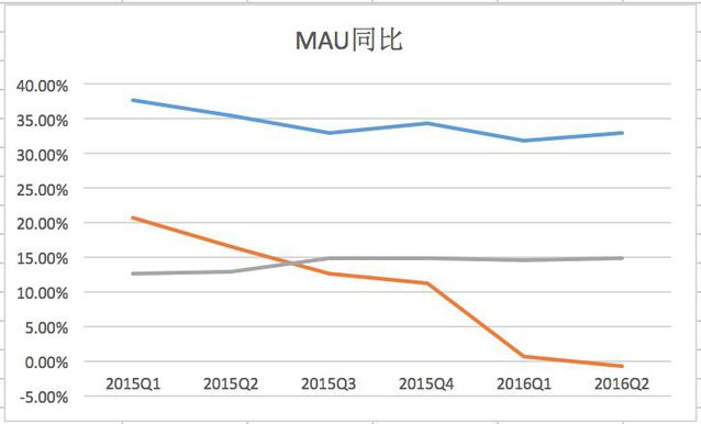 主要體現(xiàn)在銷售、治理及行政用度這一項(xiàng)中。Twitter這一塊開(kāi)支連續(xù)兩年都占據(jù)了營(yíng)收的一半,而微博則較為克制。 這可能是影響利潤(rùn)的因素之一。說(shuō)白了,Twitter的職員開(kāi)支占比比較大。 但這好像很難去解釋為什么Twitter的活躍用戶量一直得不到快速的增長(zhǎng)。 把Facebook的MAU季同比增長(zhǎng)數(shù)據(jù)加入后,可以得到如下這張圖: