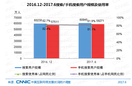 到2017年6月,我國(guó)搜索引擎用戶(hù)規(guī)劃達(dá)6.09億,運(yùn)用率為81.1%,用戶(hù)規(guī)劃較2016年末添加707萬(wàn),添加率為1.2 %;手機(jī)搜索用戶(hù)數(shù)達(dá)5.93億,運(yùn)用率為81.9%,用戶(hù)規(guī)劃較2016年末添加1760萬(wàn),添加率為3.1%。