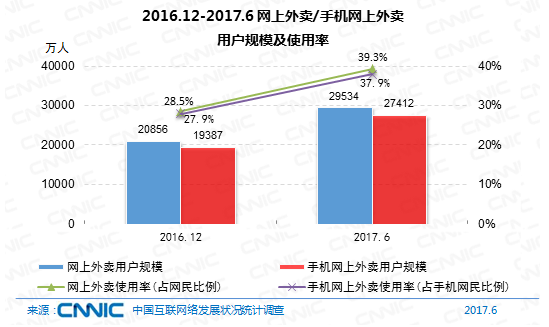 到2017年6月,我國(guó)網(wǎng)上外賣(mài)用戶(hù)規(guī)劃到達(dá)2.95億,較2016年末添加8678萬(wàn),添加率到達(dá)41.6%。其間,我國(guó)手機(jī)網(wǎng)上外賣(mài)用戶(hù)規(guī)劃到達(dá)2.74億,添加率為41.4%,運(yùn)用份額到達(dá)37.9%,提高10個(gè)百分點(diǎn)。