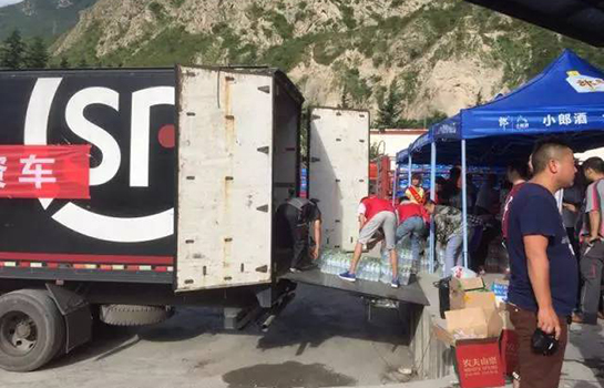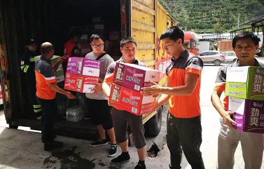 申通快遞員為九寨溝哀鴻免費發(fā)放應(yīng)急救災(zāi)物資。