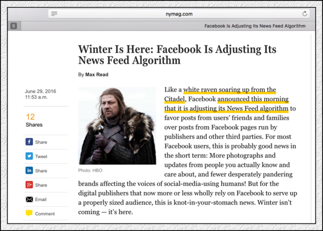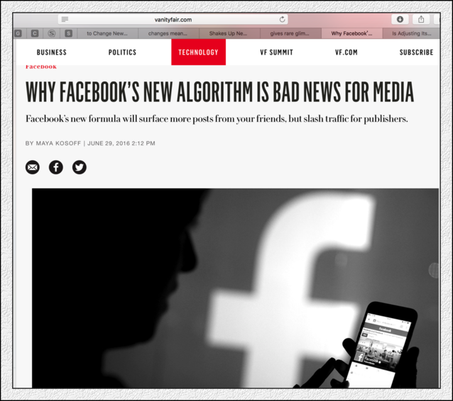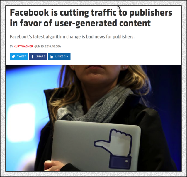 6月底,F(xiàn)acebook又公布調(diào)整算法了,這回調(diào)整,受傷的仍是媒體(Publishers)。幾乎所有的美國媒體這幾天討論的都是Facebook算法,以及自己身上正在流血的傷口?膳碌氖牵襟w們?cè)谶M(jìn)行這次報(bào)道的時(shí)候,洋溢的是某種哀怨,而不是憤怒。他們憤怒,但表現(xiàn)的只是哀怨。與狼共舞,不時(shí)地被狼咬上一口,很正常的。 在2016年5月經(jīng)歷了“Facebook新聞偏見門”、Facebook “蒂爾門”兩次沖擊之后,美國的媒體可能無法想象,這么快又會(huì)面對(duì)一次來自Facebook的新的震撼教育。