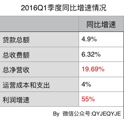 圖中紅框部門顯示,在Q2季度,Deferred revenue(遞延收入)和Cash revenue泛起失常,不遵循相關會計配比原則。 而風險預備金項,基本維持在總收費額的30%左右,符合配比原則。 (遞延收入,是暫時未確認的收益意思,由權責發(fā)生制和收付實現(xiàn)制的暫時性差異產(chǎn)生)。 因此,我們發(fā)現(xiàn)了秘密所在:宜人貸通過調(diào)整遞延收入確認時間以及人為控制的現(xiàn)金激勵,調(diào)整了會計利潤,以符合相關上市要求。 這也解釋了,為什么凈利潤和總凈營收,會在Q2季度泛起意外不符合相關會計規(guī)律的現(xiàn)象。 在以后解讀宜人貸財報,這兩個數(shù)據(jù),將是考驗利潤“含金量”相對有效的地方。 在2016Q1季度,同比增速情況如下: