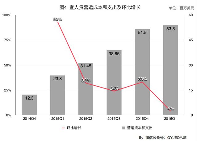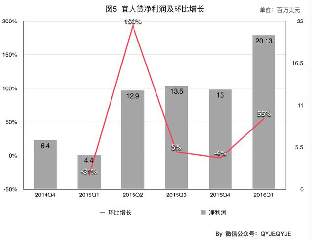 (注:總收費額,意思毛收入總額,有兩個來源部門,一是來自借錢的人,另一部門來自投資的人,其中借錢的人,占大頭。也即從事中介借貸服務,兩端收取的手續(xù)費,為其所有收入) 然而這樣一種變化趨勢,無疑是難以讓資本市場滿足的。 對于各家P2P平臺而言,平臺的借款總額,就猶如電商行業(yè)的GMV,體量和增速對公司在資本市場估值尤為致命。 作為一家奔跑著的創(chuàng)業(yè)公司,它的環(huán)比增長速度,卻泛起大幅度下滑。這是一個非常致命的信號。 假如后期發(fā)展增速繼承疲軟,那么華爾街將改變對其估值模型:由高速成長模型轉變?yōu)槌墒炀徛l(fā)展模型。 公司發(fā)展速度,回到社會資本均勻增長水準;股價也回調(diào)至緩慢上漲。 當然,下一階段考慮到?jīng)]有了春節(jié)這個季節(jié)因素影響,個人以為存在一定的止跌可能; 然而,對于最近這段時間美國嚴肅的監(jiān)管立場,LC丑聞、海內(nèi)糟糕的投資環(huán)境,2016Q2季度的表現(xiàn),應該不會比Q1季度好到哪里去。 對于資本市場而言,宜人貸發(fā)展遠景、想象力確實十分有限,股價不會泛起大幅上揚。 看點二:凈利潤表現(xiàn)搶眼,原來是存在很顯著的“操作利潤”情況