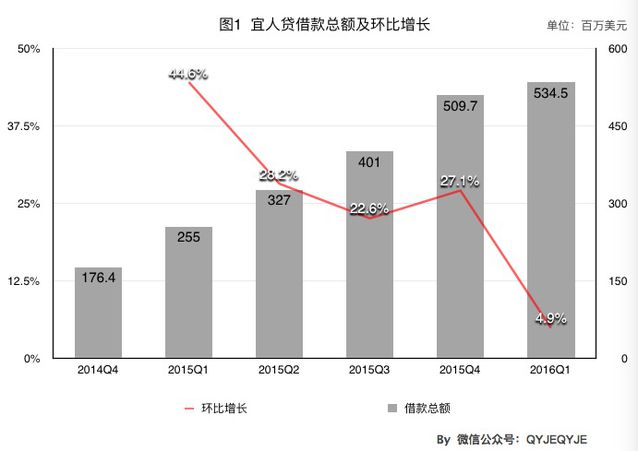 近期,跟著P2P標桿Lending Club的隕落,股價斷崖式暴跌,9年的co-founder and CEO被逐出公司,fintech概念從神壇走下; 美國財政部隨后于5月10日發(fā)布網(wǎng)貸白皮書,題為“網(wǎng)絡市場化信貸的機遇與挑戰(zhàn)”(Opportunities and Challenges in Online Marketplace Lending),闡述對行業(yè)擔憂,政策風口一再走緊; 雪上加霜的是,Google也于昨天晚間公布“下架小貸廣告”,成為壓垮美帝網(wǎng)貸的最后一根稻草,行業(yè)遠景堪憂。 而與此同時,大西洋彼岸擁有中國特色的P2P公司——宜人貸,高調(diào)發(fā)布了自己2016年Q1季度財報,華麗的數(shù)字,使得股價也應聲上漲5.83%。 本文將圍繞這一季財報,展開分析,探討財報數(shù)字背后,這家P2P公司詳細的發(fā)展情況。 財務業(yè)績分析 看點一:借款總額、總收費額,持續(xù)增長;環(huán)比增長,駛入慢車道 先來看每季度借款總額變化情況,如下圖1