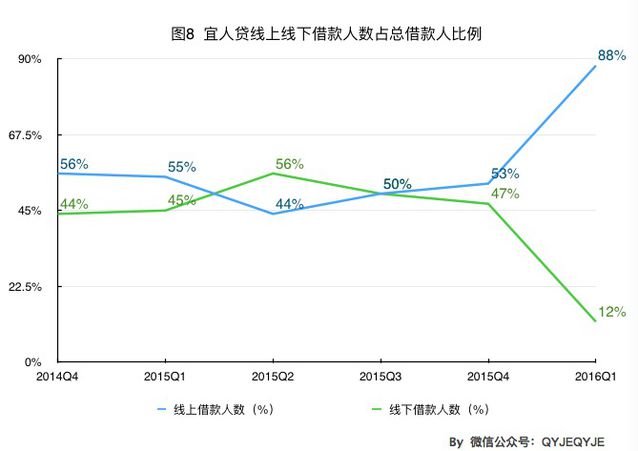 在2015Q3季度,投資者人數(shù),大幅度增加。個人以為有兩點原因: √、投資人數(shù)、變化趨勢,在IPO定價方面,影響權重巨大,所以宜信團體,把部門線下客戶互聯(lián)網(wǎng)化,予以“輸血”;除此之外,宜人貸做了相應大規(guī)模的營銷獲客行為; √、2015年6月18后的股災緊密親密相關,受傷的投資人,需要理財投資渠道,部門投資人,選了投資P2P網(wǎng)貸。 客戶變遷分析 看點四:掙脫線下依靠,線上交易成體系、移動端有了新進展