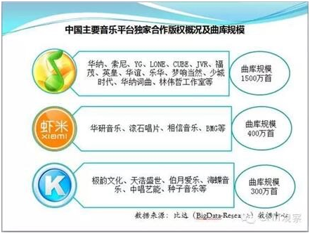 事實上,一張數(shù)字專輯的銷量可以反映出一家音樂平臺的多個方面。好比,首先可以反映出的是一家音樂平臺的人氣和用戶規(guī)模。從上述對比不丟臉出,QQ音樂顯然比酷狗擁有更為旺盛的人氣和更大的用戶規(guī)模。其次,也反映出一家音樂平臺的營銷力,銷售數(shù)字單曲與網(wǎng)友自行收聽免費單曲是完全不同的用戶行為,從上述對比來看,QQ用戶的活躍度和消費能力更高,而酷狗區(qū)區(qū)不足5萬的銷量則反映出了酷狗這家音樂平臺用戶活躍度和消費能力的不足。 實際上,之所以有這樣的懸殊,主要還在于一家音樂平臺是否能獲得大牌本身的認(rèn)可和資源整合能力。以張杰為例,與老東家天娛解約后,張杰的新專輯與福茂唱片展開戰(zhàn)略合作,開啟個人“我想”音樂計劃。而作為福茂唱片的獨家版權(quán)合作伙伴,張杰入駐福茂后也獨家牽手QQ音樂,成為平臺上又一閃亮的巨星,騰訊公司副總裁彭迦信先生曾在發(fā)布會現(xiàn)場宣布了張杰首張數(shù)字單曲的預(yù)售成績,最新單曲《我想》僅預(yù)售48小時就達(dá)50萬白金銷量,創(chuàng)造未正式上線就破白金銷量的新紀(jì)錄,白金唱片認(rèn)證也成為QQ音樂送給張杰全新啟航最好的見面禮,而正式上線僅兩天總銷量突破70萬,音樂價值得到充分彰顯。 數(shù)據(jù)顯示,作為中國數(shù)字專輯發(fā)行序幕的開啟者,從2014年底周杰倫的《哎呦,不錯哦》開始到2015年,QQ音樂平臺共計為近20位歌手發(fā)行共近30張數(shù)字專輯,從首創(chuàng)巨星周杰倫到新偶像鹿晗,再到韓國天團BIGBANG、歐美天后Rihanna,僅一年時間數(shù)字專輯總銷量突破1000萬張,鹿晗和BIGBANG、Rihanna等銷量屢破百萬張銷量紀(jì)錄,QQ音樂此舉也被以為,標(biāo)志著中國數(shù)字音樂時代的正式來臨。 而反觀酷狗,在數(shù)字專輯和數(shù)字單曲的發(fā)行力和營銷力上仍是力不從心的。 版權(quán)危機 版權(quán)是一家音樂平臺的立命之本,用無版權(quán)不音樂來形容亦不為過。目前主要平臺音樂版權(quán)及曲庫貯備情況可以從下圖中一探畢竟:
