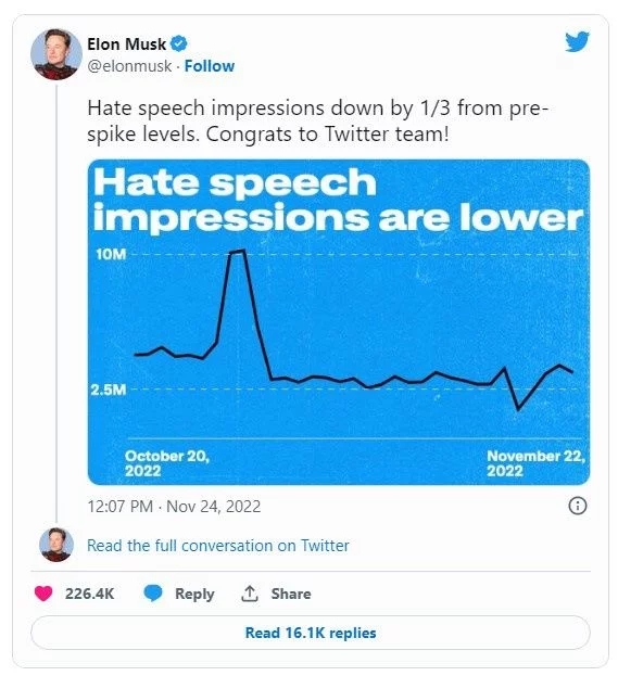 11 月 25 日消息,埃隆・馬斯克(Elon Musk)今日發(fā)布推文表明,自接手 Twitter 以來(lái),用戶對(duì)該社交渠道的仇視言觀感有所改善。馬斯克稱,