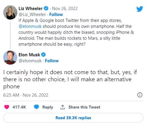 近來(lái),視頻播客節(jié)目Liz Wheeler Show的主持人利茲·惠勒發(fā)推文表明,“假如蘋果和谷歌從它們的使用商鋪移除推特,馬斯克應(yīng)該生產(chǎn)自己的智能手機(jī)。