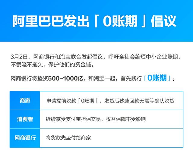 3月2日,網商銀行和淘寶聯合建議倡議,呼吁全社會縮短中小企業(yè)賬期,不截流不拖欠,維護他們的資金鏈;網商銀行將墊資500-1000億,和淘寶一起,