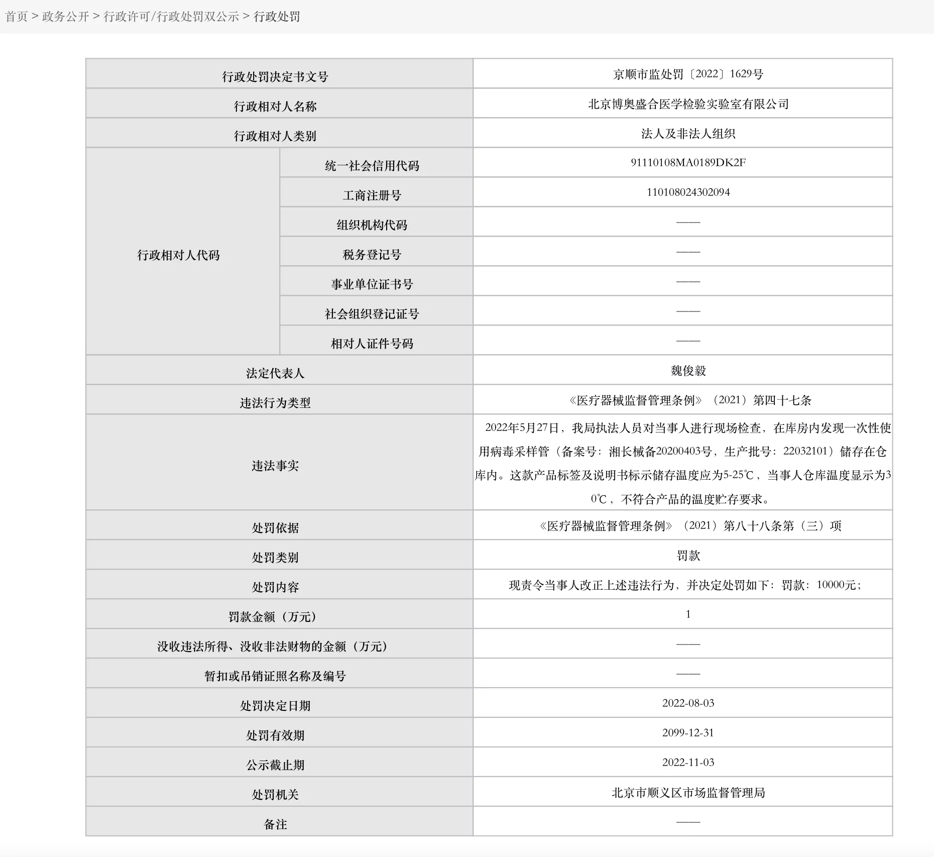 據(jù)北京市監(jiān)局網(wǎng)站音訊,2022年5月27日,北京市順義區(qū)商場監(jiān)督管理局執(zhí)法人員對北京博奧盛合醫(yī)學(xué)查驗實驗室有限公司進行現(xiàn)場查看,