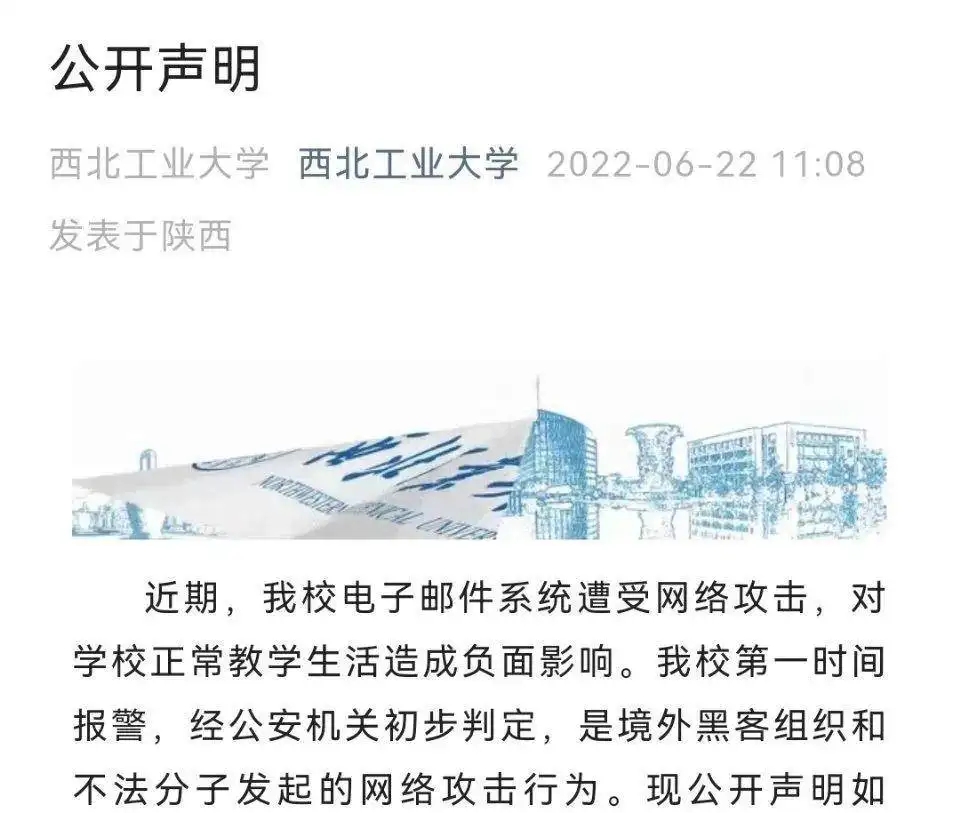 據(jù)央視新聞報道,9月5日,國家計算機病毒應(yīng)急處理中心和360公司別離發(fā)布了關(guān)于西北工業(yè)大學(xué)遭受境外網(wǎng)絡(luò)進犯的查詢報告,查詢發(fā)現(xiàn),