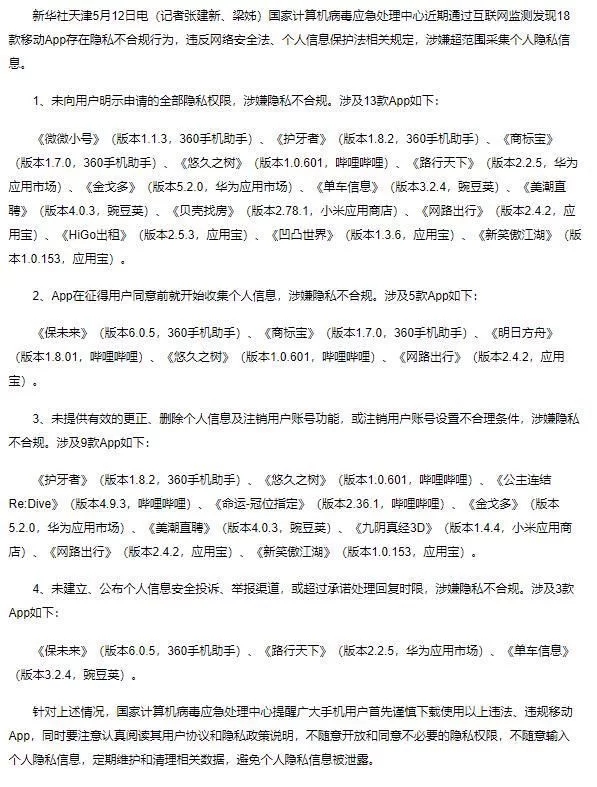 來自新華網(wǎng)5月12日的消息,國家計算機病毒應(yīng)急處理中心監(jiān)測發(fā)現(xiàn)十八款A(yù)PP存在隱私不合規(guī)行為,違反網(wǎng)絡(luò)安全法、個人信息保護法相關(guān)規(guī)定,
