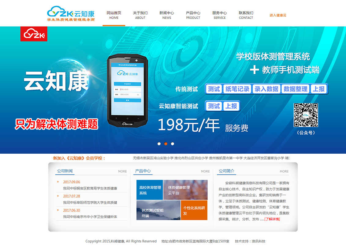 安徽科昶健康信息科技有限公司是一家擁有自主核心技術、自主知識產權,致力于發(fā)展健康產業(yè)的創(chuàng)新型高科技企業(yè)。集研發(fā)和銷售于一體,立足于體質測試、健康檢測、體育健康教學、管理領域。公司自主研發(fā)的“云知康”學生體質健康管理系統(tǒng)采用先進的云平臺技術,是集數據采集、統(tǒng)計、分析、發(fā)布、健康指導的學生體質健康綜合管理云平臺。